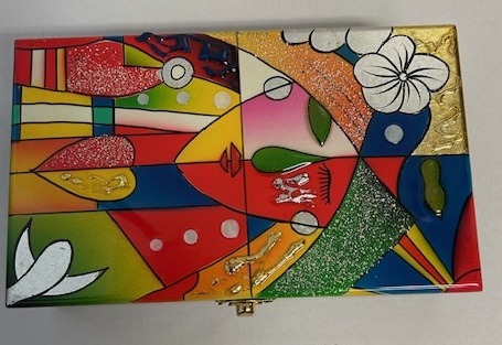 Lacquer Inlay Jewelry Box. The lid features , vibrant of flowers , inside have Mirror Bangle Earrings Pendant